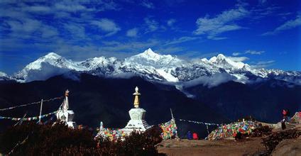 滇藏线德钦附近,有很多地方能够看见梅里雪山。杰文说,看日照金山最美的地方并不是飞来寺。飞来寺人多,因为在国道边,下车就好看雪山,早晨推窗便见金顶。想看壮美的景,应该去雾浓顶,视野更为广阔:先是淡淡的天光,接着太阳如火球般冉冉升起;金色的光线,最先照亮的是金字塔般雄伟的卡瓦格博,接着很快便染红了整个群山和天空的云彩。可惜天不作美,我们到来时天阴雾大,无缘观赏到日照金山。