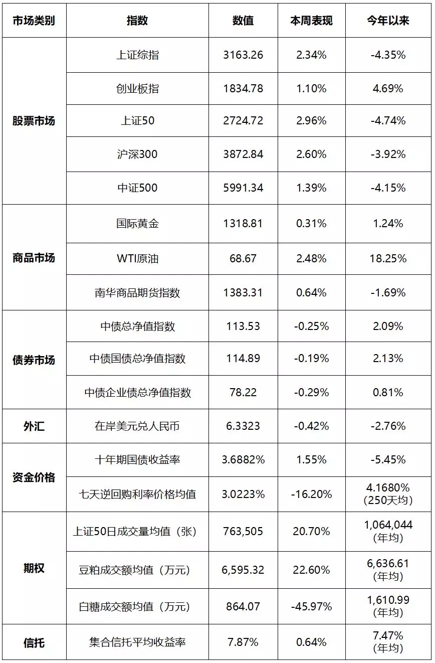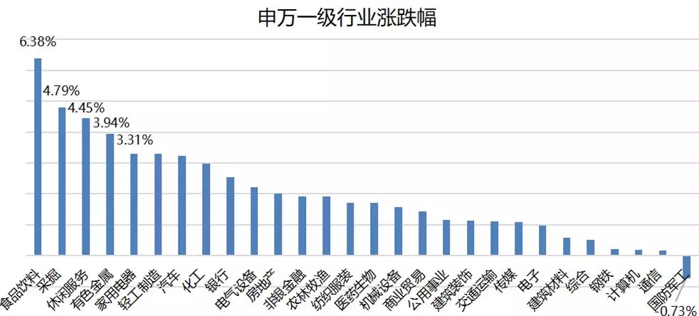 本周股票市场强势反弹,各指数与板块雨露均沾,资金更青睐于优质白马企业。从各主要指数来看,上证指数上涨2.34%,创业板指数上涨1.10%;结构上来看,上证50上涨2.96%,沪深300上涨2.6%,中证500上涨1.39%。从行业涨跌幅来看,本周反弹为市场普涨,除国防军工外,其他所有行业均上涨。上涨前五的行业分别为食品饮料、采掘、休闲服务、有色金属和家用电器,上涨幅度分别为6.38%、4.79%、4.45%、3.94%和3.31%。