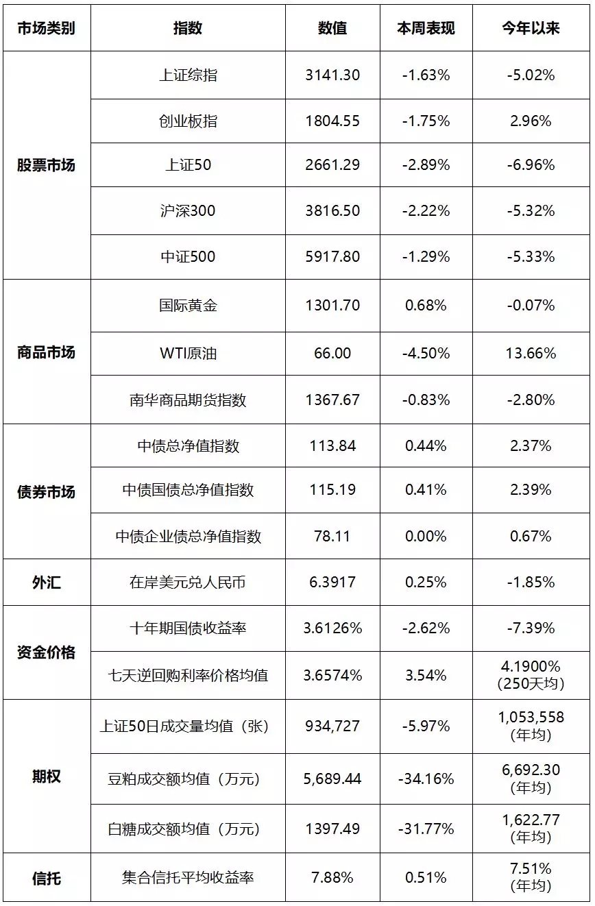 本周股票市场权重股高开低走,各指数普跌,行业板块下跌占比78.57%。本周开盘,上证50高开后两次上冲未果,然后转头震荡向下,全周疲软,压制了上周末中美贸易和谈亢奋情绪。从各主要指数来看,上证指数下跌1.63%,创业板指数下跌1.75%;代表权重股的上证50下跌2.89%,沪深300下跌2.22%,中证500下跌1.29%。从行业涨跌幅来看,仅有5个行业上涨,分别为医药生物、商业贸易、汽车、农林牧渔、交通运输,上涨幅度分别为2.68%、1.88%、0.81%、0.38%和0.34%;下跌前五行业分别为采掘、家用电器、钢铁、房地产和有色金属,下跌幅度分别为5.43%、4.07%、3.07%、2.96%、2.92%。