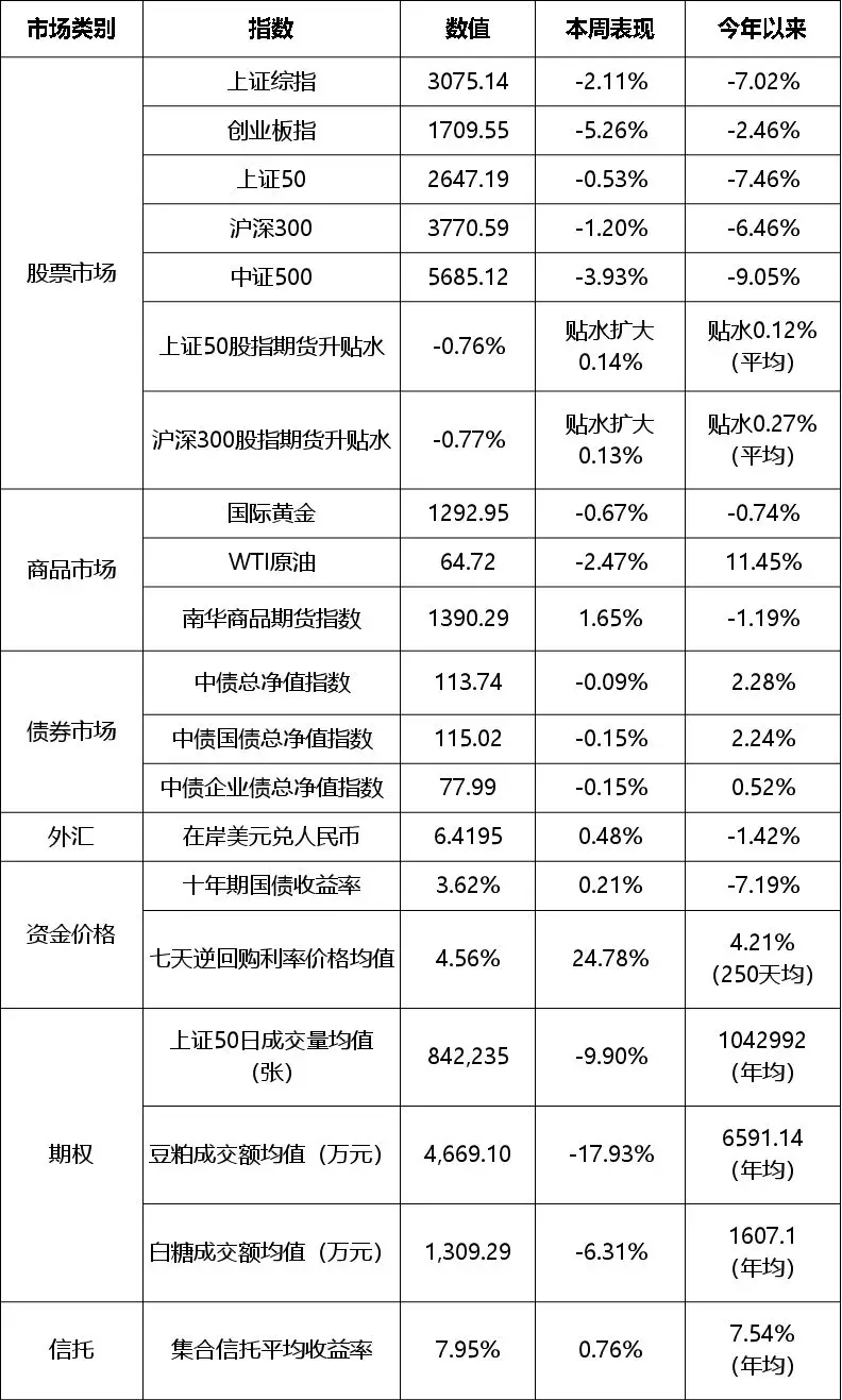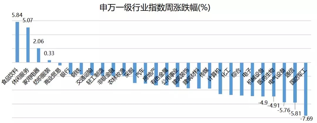 本周市场剧烈波动,上证指数创出年内新低后反弹,消费相关板块一枝独秀。本周弱势开盘,周三在上证50带领下低开低走,全天最低点收盘,创新年内新低,周四短暂反弹,周五冲高后下跌。从各主要指数涨跌幅,上证指数下跌2.11%,创业板指数下跌5.26%;代表权重股的上证50下跌0.53%,沪深300下跌1.20%,中证500下跌3.93%。股指期货方面,上证50股指期货本周五收盘贴水0.76%,相比上周五收盘贴水扩大0.14%,今年以来平均贴水0.12%;沪深300股指期货本周五收盘贴水0.77%,相比上周五收盘,贴水扩大0.13%,今年以来平均贴水0.27%。从行业涨跌幅来看,仅有4个行业上涨,分别为食品饮料、休闲服务、家用电器、纺织服装,上涨幅度分别为5.84%、5.07%、2.06%和0.33%;下跌前五行业分别为国防军工、通信、电气设备、医药生物和机械设备,下跌幅度分别为7,69%、5.81%、5.76%、4.91%和4.9%。消费相关板块一枝独秀,体现了主流机构追求确定性的价值取向。