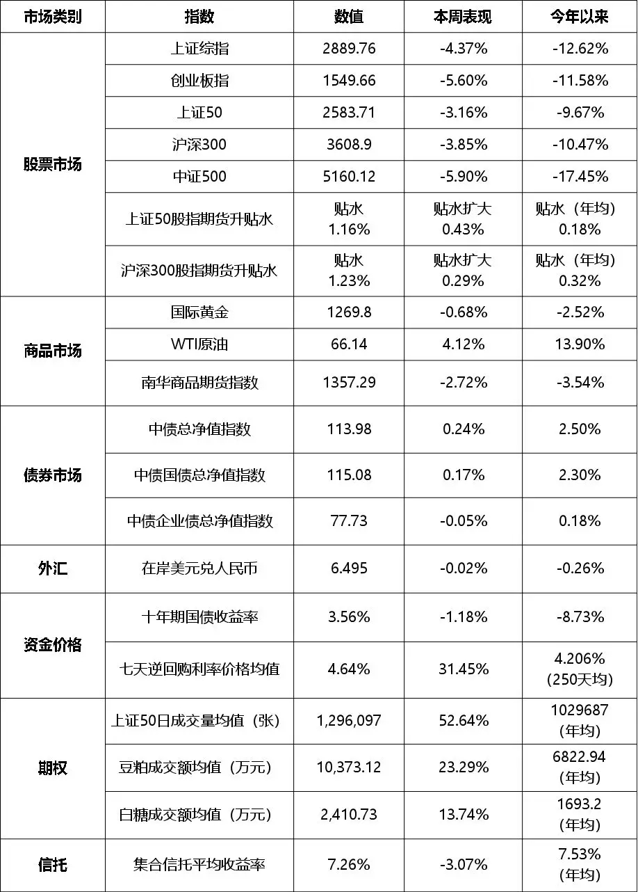 本周市场各指数和行业板块几乎呈现单边下跌态势。从各主要指数来看,上证指数下跌4.37%,创业板指数下跌5.60%;结构上来看,上证50下跌3.16%,沪深300下跌3.85%,中证500下跌5.90%,继创业板之后,中证500指数也创出年内新低。申万一级行业板块全面下跌:抗跌前五行业板块分别为休闲服务、医药生物、银行、钢铁和食品饮料,跌幅分别为1.77%、1.81%、1.95%、2.14%和2.28%,主要是内需相关板块;跌幅前五板块分别为通信、计算机、综合、电子和有色金属,跌幅分别为10.78%、8.77%、8.51%、8.03%和7.70%,主要是贸易战影响较大板块。