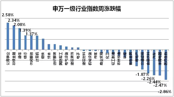 周五下午指数异动上扬,全周基本持平,行业板块分化明显。从各主要指数来看,本周上证指数下跌0.07%,创业板指数下跌0.55%,其中,周五下午上证指数上涨2.17%,创业板指数上涨1.11%;结构上来看,上证50上涨0.68%,沪深300上涨0.01%,中证500下跌0.56%,其中,周五下午上证50上涨3.05%,沪深300上涨2.29%,中证500上涨1.38%。从行业板块涨跌幅来看,涨幅前五行业板块分别公用事业、非银金融、通信、银行和休闲服务,涨幅分别为2.58%、2.34%、2.08%、1.39%和1.37%;跌幅前五板块分别为医药生物、家用电器、汽车、食品饮料和交通运输,跌幅分别为2.86%、2.47%、2.44%、2.26%和1.87%。