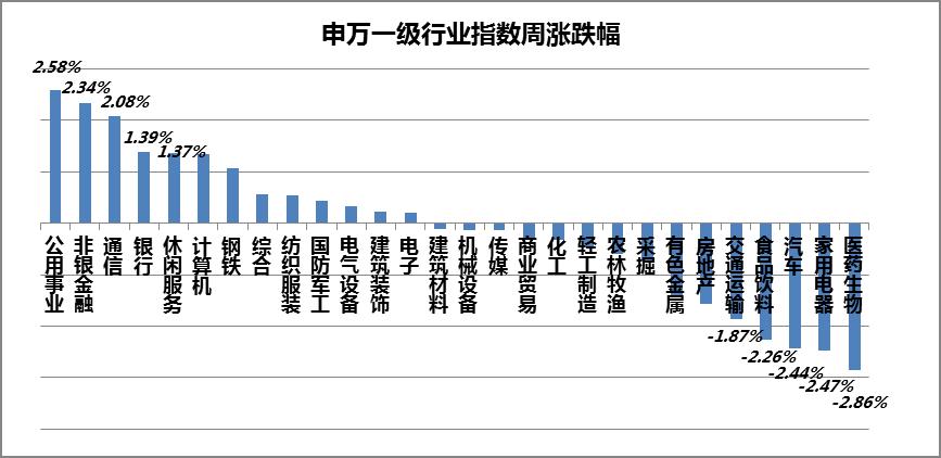 本周市场开盘上冲后调整,整体较为稳健。从各主要指数来看,上证指数上涨1.57%,创业板指数下跌0.93%;结构上来看,上证50上涨1.26 %,沪深300上涨0.81%,中证500上涨1.43%。申万一级行业板块方面,涨幅前五行业板分别为公用事业、非银金融、通信、银行和休闲服务,涨幅分别为2.58%、2.34%、2.08%、1.39%和1.37%;跌幅前五板块分别为医药生物、家用电器、汽车、食品饮料和交通运输,跌幅分别为2.86%、2.47%、2.44%、2.26%和1.87%。