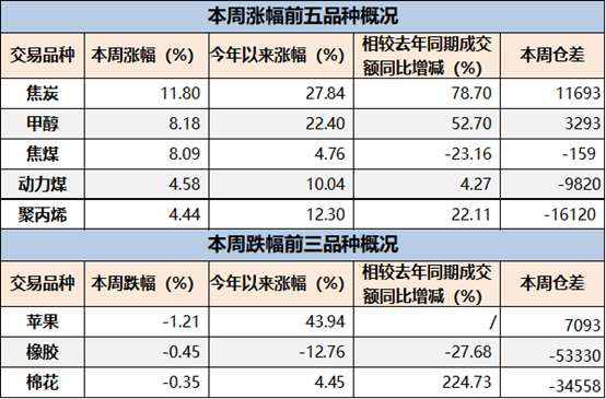 注:1.此表所选品种均为本周总成交额百亿以上规模交易品种;2.本周仓差=本周最后一个交易日持单量前二十名会员持多单量总和-本周最后一个交易日持单量前二十名会员持空单量总和。