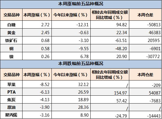 注:1.此表所选品种均为本周总成交额百亿以上规模交易品种;2.本周仓差=本周最后一个交易日持单量前二十名会员持多单量总和-本周最后一个交易日持单量前二十名会员持空单量总和。