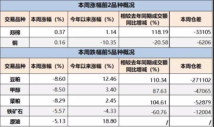 注:1.此表所选品种均为本周总成交额百亿以上规模交易品种;2.本周仓差=本周最后一个交易日持单量前二十名会员持多单量总和-本周最后一个交易日持单量前二十名会员持空单量总和;3.本周涨幅排名符合本文标准的品种仅郑棉与铜。