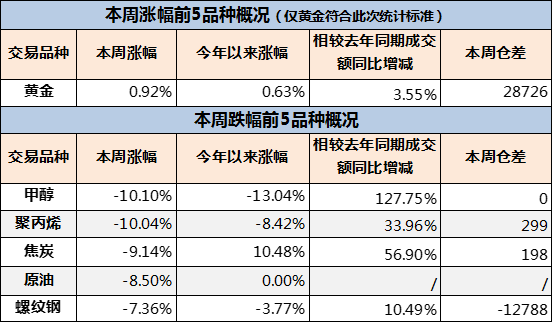 注:表中涨跌幅前五统计的是周总成交额百亿以上品种主力合约涨跌幅。
