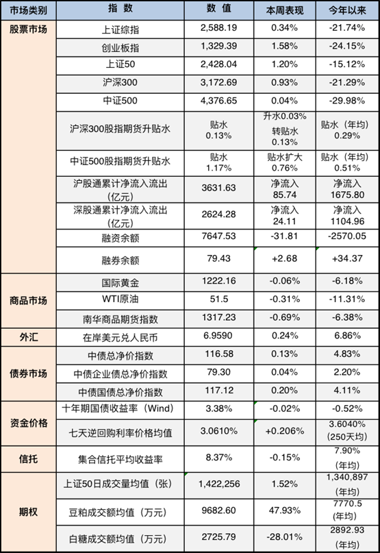 国内市场,本周A股交易量维持低位,上证指数周涨0.34%;深圳成指数周涨0.59%,创业板周涨1.58%,市场处于观望态势,静待靴子落地。