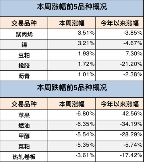 注:表中涨跌幅前五统计的是周总成交额百亿以上品种主力合约涨跌幅。