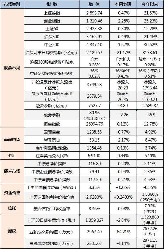 国内市场,本周沪深两市日均交易额仅2189.57亿元,环比上周下降21.17%,创出近期新低。上证指数周跌0.47%,深圳成指数周跌1.35%,创业板周跌2.28%,悲观情绪弥漫。市场热点比较散乱,没有集中进攻的方向。本周11月的各项经济指标陆续公布。我们留意到11月的乘用车销售情况持续恶化,同比下滑18%;新能源汽车维持高增长,同比增长18%,成为低迷车市中的亮点。11月单月社会零售总额同比增长8.1%,低于预期8.8%;从11月主要经济指标来看,国内经济表现并未明显好转。