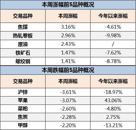注:表中涨跌幅前五统计的是周总成交额百亿以上品种主力合约涨跌幅。