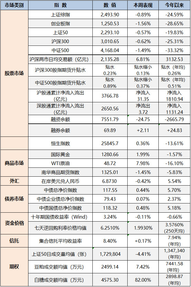 本报告覆盖了2018年最后一个交易周,上证指数下跌0.89%,深圳成指数下跌1.33%,创业板下跌1.56%,沪深两市日均成交额为2135.28亿元,相比上周上升6.81%。国际市场,香港恒生指数下跌0.97%;日经225下跌0.75%,日经指数波动较大;欧洲50指数下跌0.17%;美国道琼斯工业指数上涨2.75%,标普500指数上涨2.86%,纳斯达克指数上涨3.97%。市场普遍认为美股本周反弹要归功于养老基金640亿美金的买入行动。