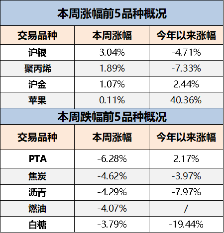 注:表中涨跌幅前五统计的是周总成交额百亿以上品种主力合约涨跌幅