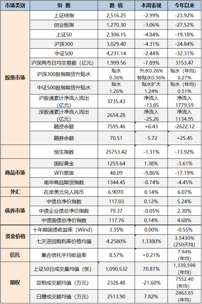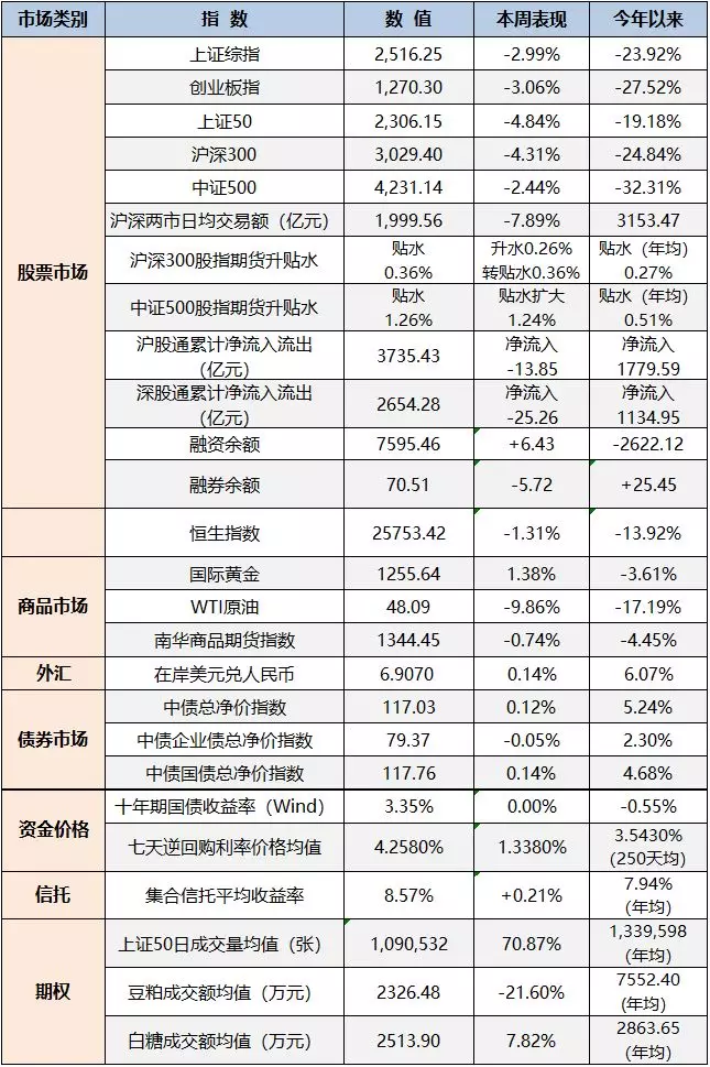 全球主要股票市场本周均大幅下跌。中国市场,上证指数周跌2.99%,深圳成指数周跌3.83%,创业板周跌3.06%,香港恒生指数周跌1.31%。上证一度失守2500点,市场信心低至冰点。国际市场,美国道琼斯工业指数和纳斯达克指数本周分别下跌6.87%和8.36%,创2008年底以来十年单周最大跌幅,标普500下跌7.05%,创2008年底以来第二大跌幅;其他重要国际指数,日经225周跌5.65%,欧洲50指数周跌2.99%。