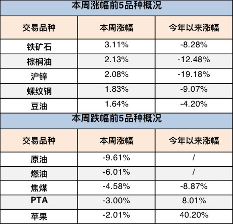 注:表中涨跌幅前五统计的是周总成交额百亿以上品种主力合约涨跌幅。