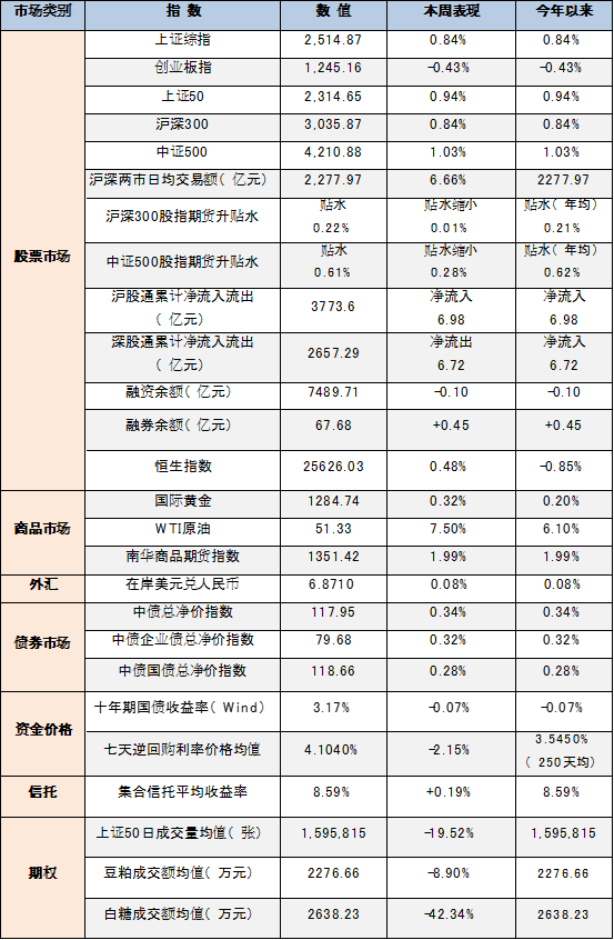 国内市场,月初公布的制造业PMI值为49.7,这是2017年5月以来,首次跌破50的荣枯线,节后市场弱势开盘,连跌两天,周五开盘后上证指数一度跌破前低2449.2,最低下杀至2440.91,随后市场强势反攻,全天收涨2.05%,收复2500点。本周沪深两市日均交易额为2277.97亿元,环比上涨6.66%,市场热情所有提升。周五收盘后,央行再次降准1%为市场注入流动性,本次降准幅度超预期,预计本次降准将释放1.5万亿元,净投放8000万元资金。本周五,李克强总理视察国有银行,再次督促银行为“中小企业”贷款,预期中小企业资金紧张局面将持续改善。新个人所得税改革即将施行,新版的个人所得税实质上是对工薪阶层“减税”,有利于国内消费保持稳定。政策面的一系列事件持续为金融市场注入“强心剂”。