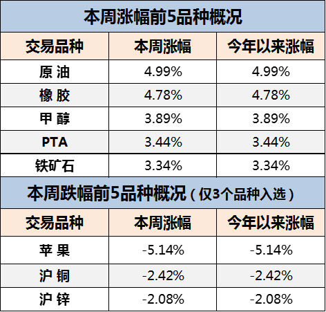 注:表中涨跌幅前五统计的是周总成交额百亿以上品种主力合约涨跌幅