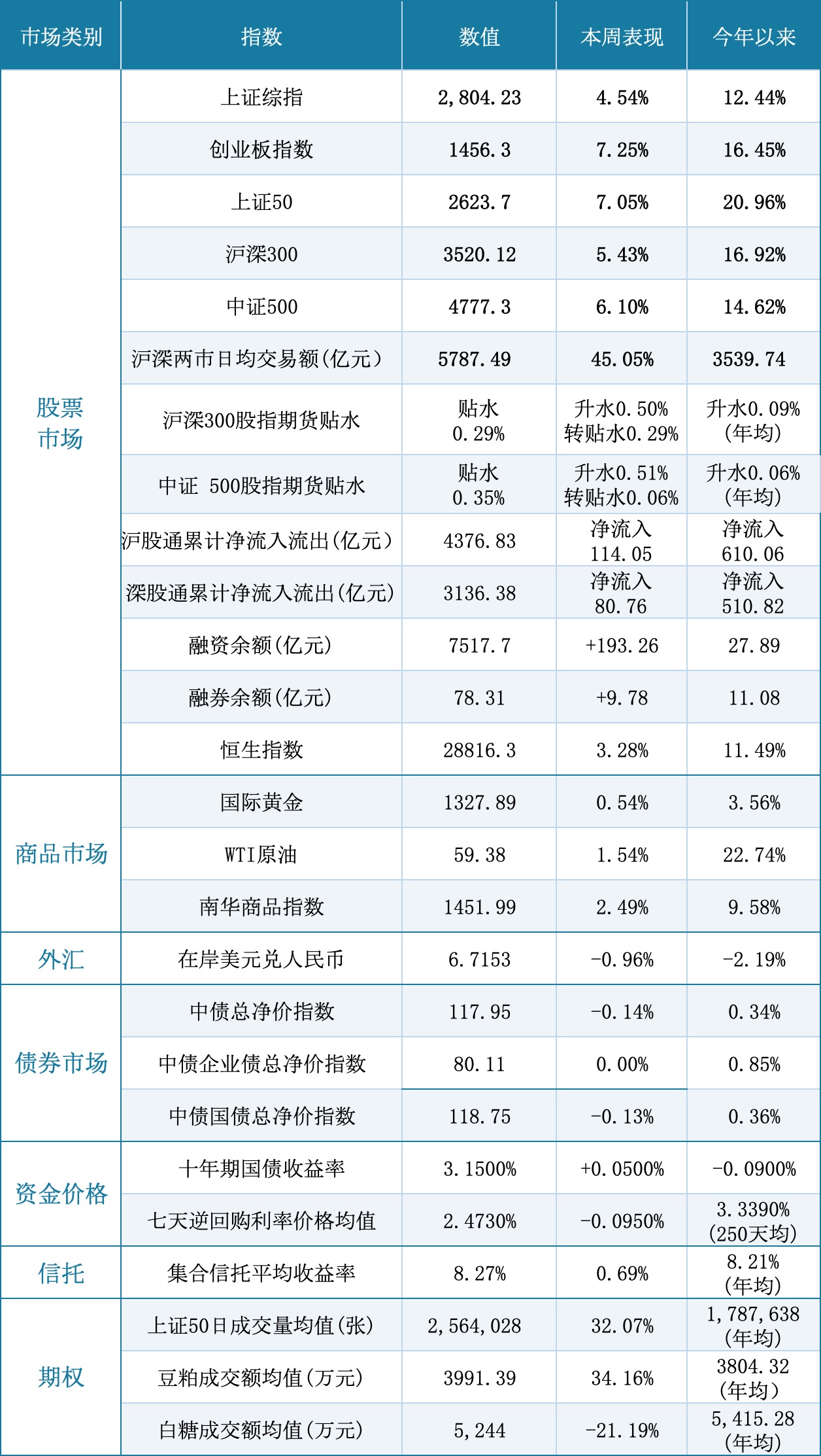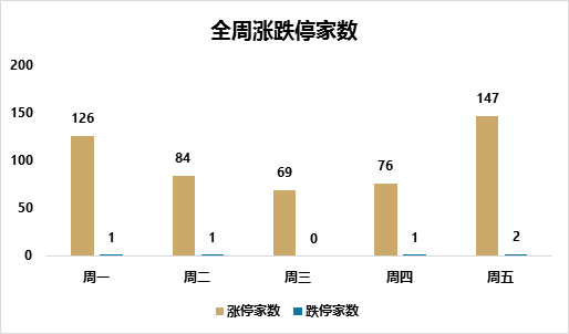本周市场全面飘红,市场温度持续上升。上周五收盘后公布的社融数据、M2等货币数据超预期,市场认为央行可能再次大放水。周一开盘,上证指数高开高走,全天大涨2.68%;随后三个交易日,市场横盘震荡,快速完成换手;周五上午短暂调整后,在证券板块带动下,全市场各大指数大幅上扬,证券B在下午两点十分后更是直接打涨停至收盘。从涨跌停家数来看,全周日均跌停家数仅1家,日均涨停家数过百只,市场情绪高昂。