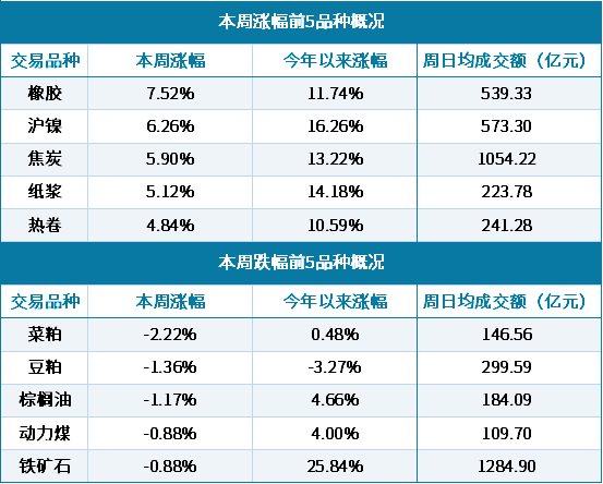 注:涨跌排序按周日均成交额百亿以上品种主力合约计算