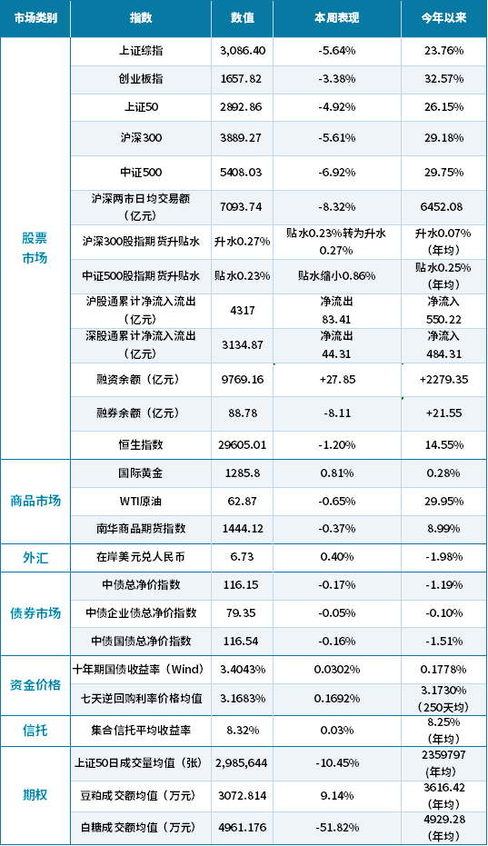 本周股市各大指数全线创今年以来最大周跌幅。上半周资金从题材股撤出,切换到以养殖为代表的基本面指标股,风险偏好下降明显。下半周题材指标股和基本面指标股共振下跌,风险偏好进一步全面下降。