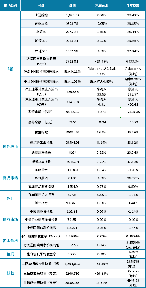 本周商品市场整体上涨,文华财经商品指数周度上涨0.33%,本周日均成交额为10824.84亿元(仅计算各品种主力合约成交额),环比下跌15.40%。黑色系全体上涨,铁矿领涨3.31%,螺纹、热卷分别上涨2.38%、2.99%。能源板块整体下跌,原油、燃油分别下跌2.09%、2.57%。化工板块集体上涨,橡胶领涨3.82%,PVC上涨1.59%。贵金属板块中,黄金上涨0.14%、白银下跌0.37%。有色金属涨跌互现,铜铝微跌,锌上涨0.58%。油脂油料走势分化,菜粕、豆粕分别上涨0.51%、0.35%,棕榈油下跌0.18%。软商品中白糖较上周回调1.76%,周度日均成交额较去年日均成交额上涨161.85%。