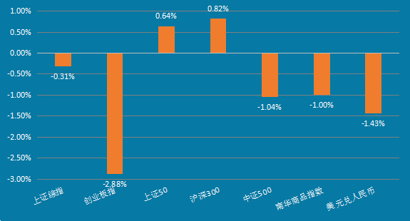 报告期内,上证指数累计下跌0.31%,创业板指数累计下跌2.88%,上证50指数上涨0.64%,沪深300指数上涨0.82%,中证500指数下跌1.04%,南华商品指数下跌1%,美元兑人民币下跌1.43%,沪深300股指期货贴水由0.3%转为升水0.16%,中证500股指期货贴水由0.6%转为升水0.14%,。