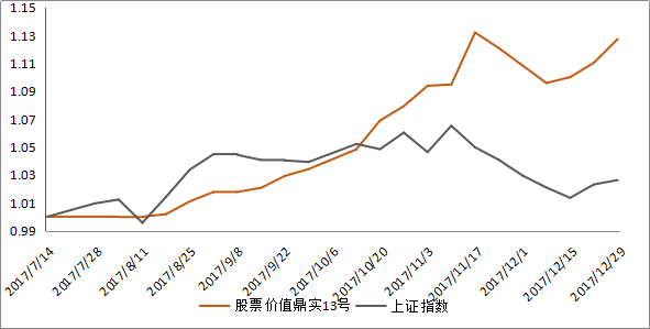 股票价值鼎实13号目前共投资了四个标的,均是在价值投资领域具有优异的过往业绩且优势明显的投顾,所投标的本月总体均实现了正收益,净值稳步上涨。因国庆节后市场涨幅较大,股票价值鼎实13号保留了部分资金做类现金管理,11月及12月的市场回调中,我们已逐步加大了股票类私募的仓位,本月股票价值鼎实13号净值稳步回升,已基本收复前期跌幅。