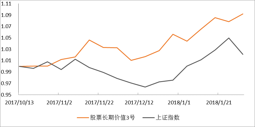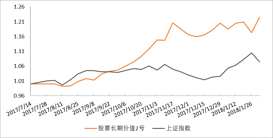 截止1月末,股票长期价值2号本月净值上涨1.66%,所投向的是南土投资姜菏泽所管理产品。姜菏泽股票多头仓位由93.59%降至82.18%,在投资标的上,美的集团、万华化学退出前五大持仓,增持济川药业、闻泰科技、分众传媒,2017年底五大持仓分别为三安光电(21.79%)、济川药业(8.96%)、闻泰科技(7.18%)、分众传媒(5.46%)和格力电器(3.50%)。重仓股三安光电在报告期内回撤-8.11%,第三大重仓股闻泰科技本月跌幅也较大,同时,所持银行、消费类白马股涨幅较大,形成一定对冲,收益较为稳健。
