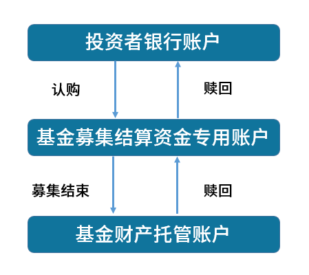 不管是证券类私募基金还是固收类私募基金,前面的资金流向是一样的,投资者认购产品时,打款到基金募集账户,基金募集结束之后,资金由募集账户转入到托管账户。基金到期或者是赎回的时候,资金从托管账户转到募集结算资金专用账户,再分配到投资者的银行账户。如下图: