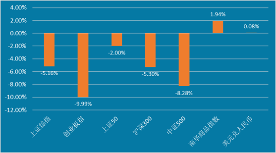 报告期内,上证综指下跌5.16%,创业板指数下跌9.99%,上证50指数下跌2.00%,沪深300指数下跌5.30%,中证500指数下跌8.28%,南华商品指数上涨1.94%,美元兑人民币上涨0.08%,沪深300股指期货由贴水0.09%扩大为0.37%,中证500股指期货由贴水0.07%扩大为0.48%。