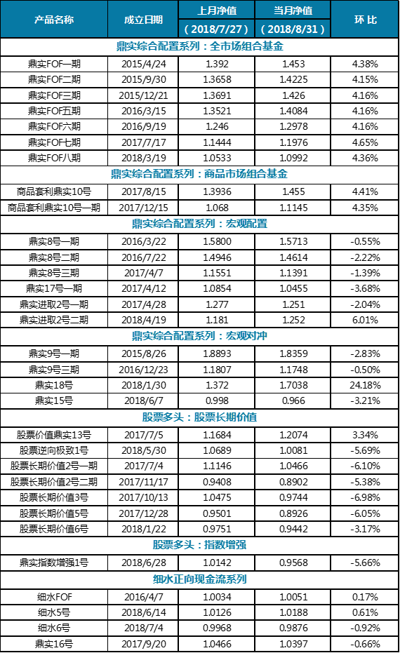 2018年8月鼎实系列产品净值表现