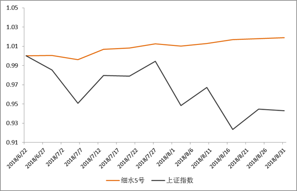 细水FOF本报告期内上涨0.17%。本报告期内股票市场持续低迷,成交量不断萎缩导致市场中性策略和股票高周转策略均表现较弱,跨境套利策略类标的也有涨有跌,商品量化CTA策略表现较好。9月份我们会减配部分alpha策略,加配量化CTA策略和某跨境套利策略。此外,我们会在建立好大类策略库和优选分类投资标的的基础上,将资金合理的配置到低相关性的资产以及策略上,使得组合的风险更小,走势更加稳健。