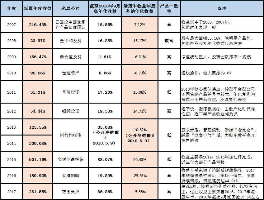 1)2007年冠军私募,云国投中国龙系列产品管理团队(现在的涌峰投资),冠军收益为216.43%