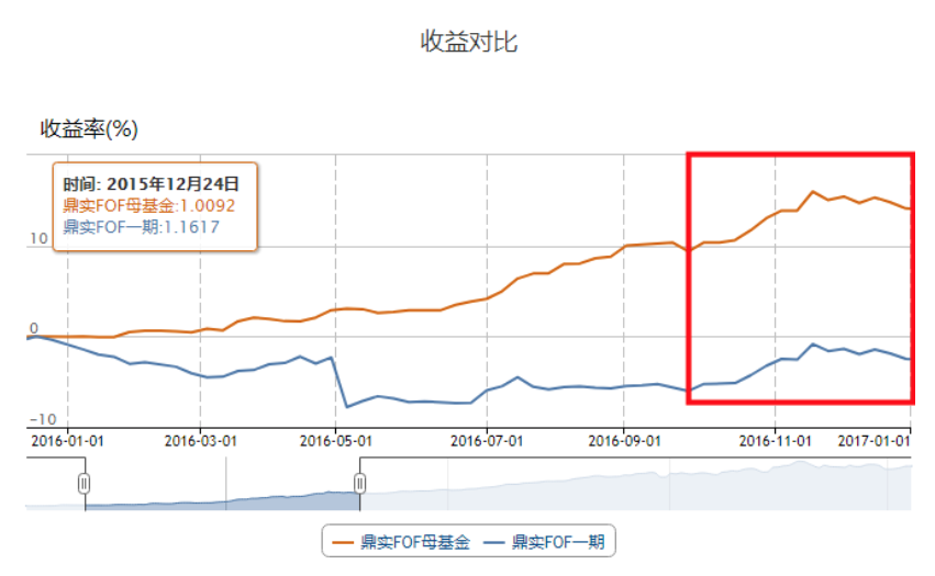 母基金成立后,FOF一期也逐步把资金转投母基金,16年没有盈利的原因主要有两个:1、由于16年5月FOF一期底层提取业绩报酬,造成了较大的回撤;2、母基金成立后,逐渐把FOF一期有流动性的标的赎回,赎回资金投向母基金,但有部分标的因为流动性原因无法赎回,直到2016年9月份以后,FOF一期走势跟母基金才逐渐趋同。