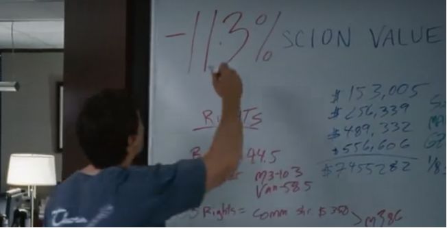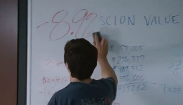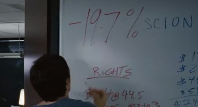 在看这部电影的时候,每一个人都会有自己不同的视角,作为私募基金从业人员,让我影响最深的是基金管理人迈克尔·巴里这个角色相关的剧情,他是最早(2005年)发现这次做空机会的人。通过仔细阅读大量乏味的资料,他发现美国住房抵押贷款证券泡沫严重,存在绝佳的做空机会。他最先设计出一种能做空的产品,这个产品每月需要承担一定数额的成本,因此在2007年房地产风暴到来之前,他管理的基金持续出现亏损。迈克尔·巴里一直在他办公室门口的一块白板上写下自己基金净值变动的百分比,刚开始是 – 8.9%。