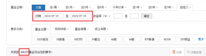 选取基金起始时间为:2014年7月15日,截止时间为2019年7月15日,在此期间运行的基金总共有4863只,