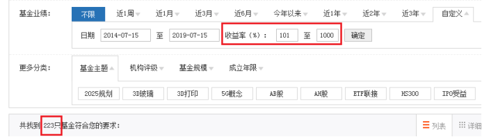 收益率超过101%(即五年年化复利为15%)的有223只,占比4.59%。