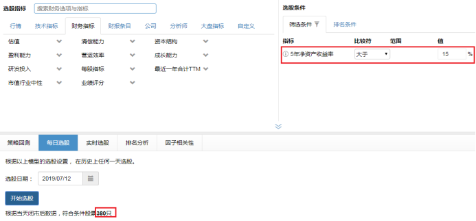 设置条件是过去五年净资产收益率超过15%,得到的数量是380只,目前A股全部上市公司的数量为3632只,占比10.46%。