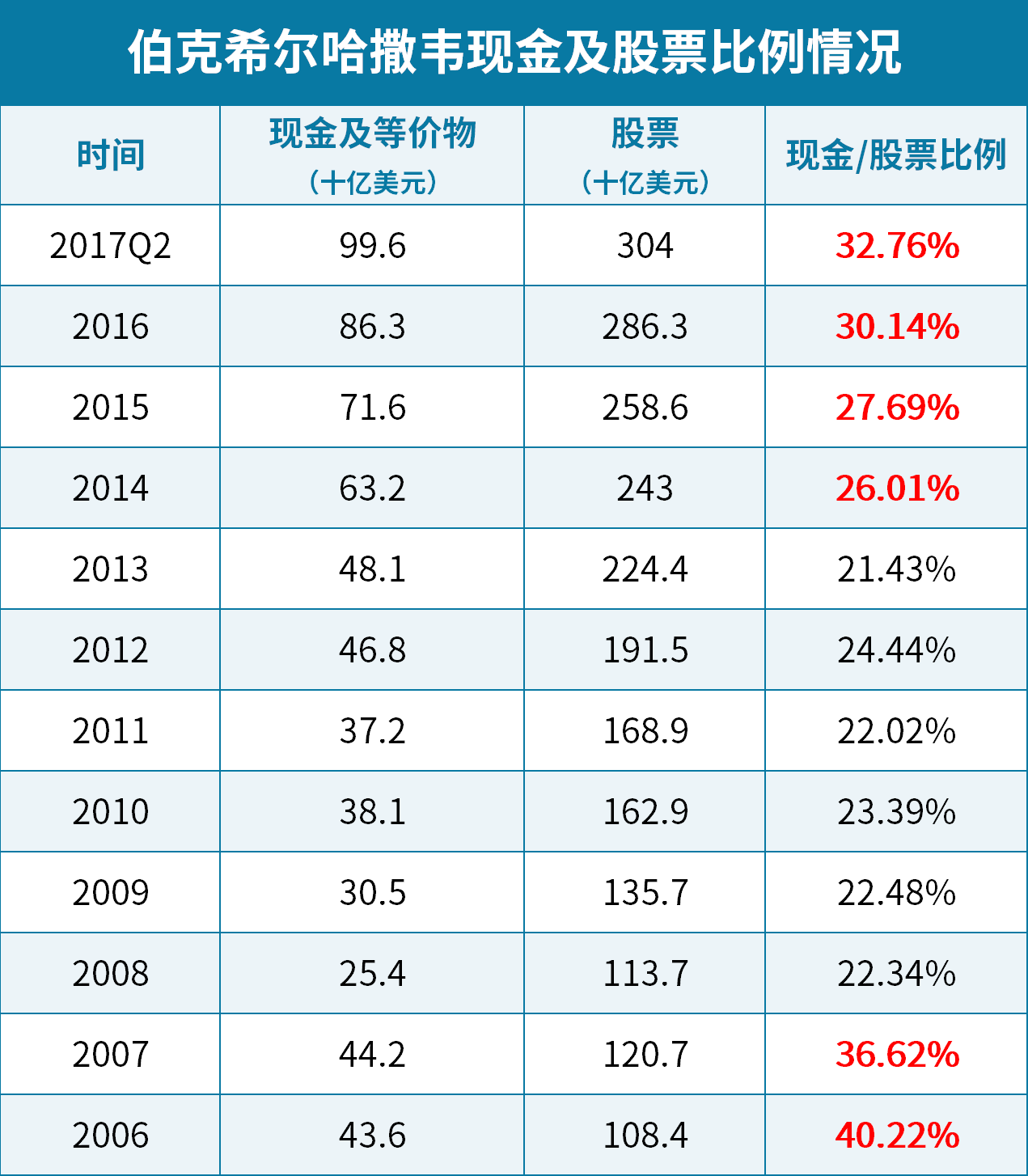 以股神巴菲特为例,下图是过去十几年他掌管的伯克希尔哈撒韦公司的现金/股票的情况: